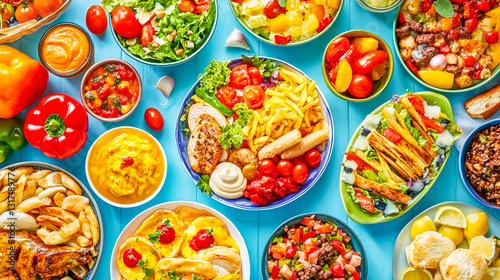 A variety of delicious food dishes arranged on a table, featuring vibrant colors and diverse cuisines