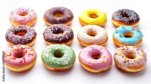 A variety of doughnuts with icing, bakery collection, flat design, vibrant colors, isolated on white background