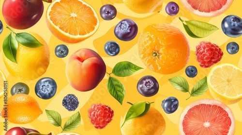 A variety of fresh fruits are suspended in mid-air against a yellow background.