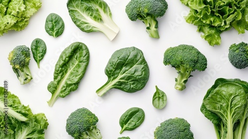 A variety of fresh green vegetables, such as spinach, lettuce, and broccoli, is laid out on a white background.