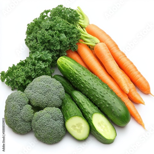A variety of fresh vegetables including kale, carrots, cucumbers, and broccoli.