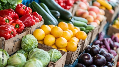 A variety of fruits and vegetables are displayed in boxes