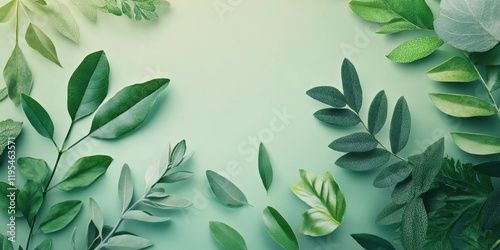 A variety of green leaves of different shapes and sizes are arranged on a light green background, creating a fresh and vibrant botanical composition