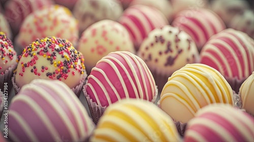 A variety of handmade chocolate sweets are spread on the table. Candy. Illustration for a banner, poster, cover, brochure or presentation.
