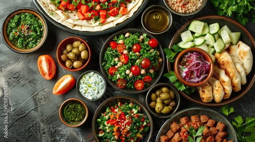 A variety of Middle Eastern dishes, including salads, dips, breads, and meat, arranged on a table.