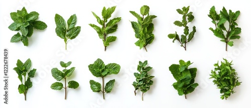 A variety of mint leaves arranged for culinary or botanical purposes.