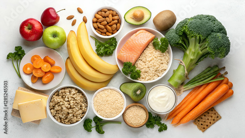 A variety of nutrient-dense foods arranged to represent a balanced diet.
