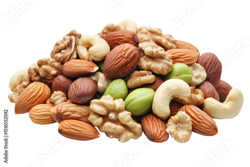 A variety of nuts including almonds, walnuts, and cashews scattered across a white background