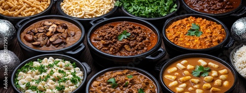 A variety of popular city main dishes including casseroles, hot chicken strips, and omelets are beautifully displayed for food lovers.