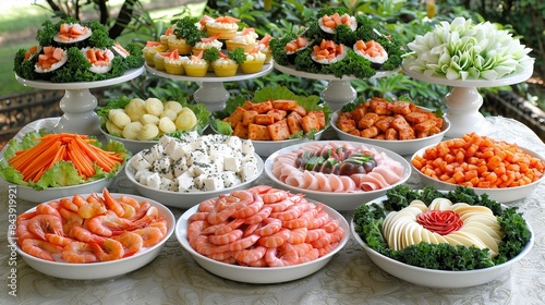 A variety of seafood, crabs and oysters, mussels and shrimp, laid out on plates. Concept: seafood delicacies, restaurants and culinary magazines