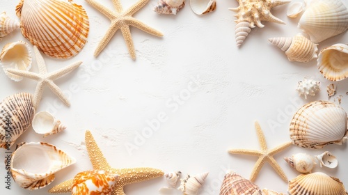A variety of seashells are artfully arranged on a white background, evoking the serene beauty of the beach and inviting viewers to embrace the spirit of summer.