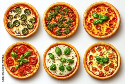 A variety of six pizzas displayed, showcasing different toppings and styles.