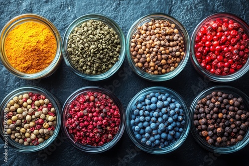 A variety of spices and seeds in glass jars arranged on a dark surface.