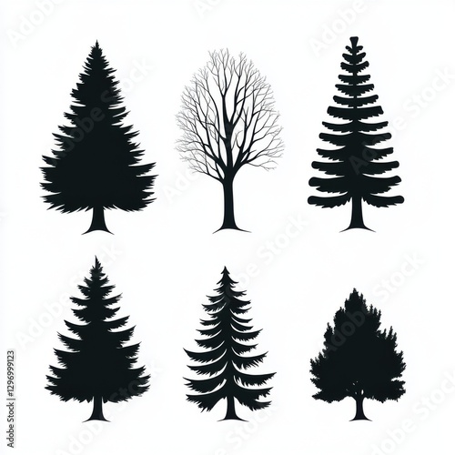 A variety of tree silhouettes, showcasing different shapes and sizes in a minimalist black-and-white design.