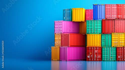 A variety of vibrant shipping containers are systematically stacked, showcasing a mix of colors. The bright blue backdrop enhances the visual appeal of this urban shipping area