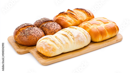 A variety of warm, freshly baked bread loaves arranged neatly on a wooden cutting board ready for serving