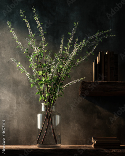 A vase with green stems sits on a shelf next to a stack of books
