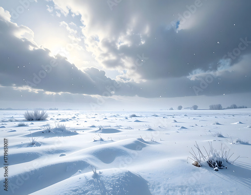 A vast and endless snowfield covered in thick layers of snow under a dramatic cloudy sky.