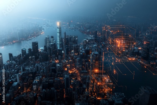 A vast cityscape illuminated by digital grids and glowing skyscrapers, symbolizing urban technological evolution and the concept of a smart city.