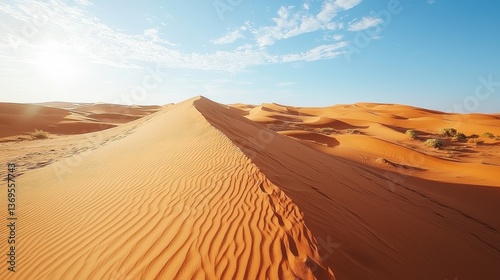 A vast desert landscape featuring rolling sand dunes under a clear blue sky, illuminated by warm sunlight.