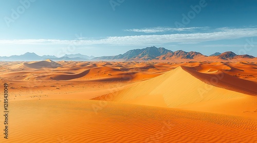 A vast desert landscape stretches out under a clear blue sky, featuring rolling sand dunes that evoke a sense of tranquility and isolation