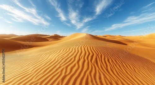 A vast desert landscape with rippling sand dunes under a bright blue sky.