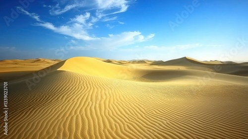 A vast desert landscape with rolling sand dunes, under a bright blue sky, highlighting the beauty and solitude of the desert.