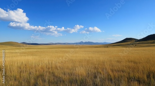 A vast, golden grassland stretches beneath a vibrant blue sky.