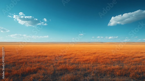 A vast, golden prairie stretches under a vibrant blue sky.