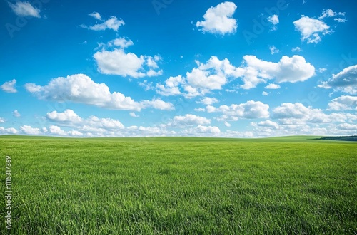 A vast grassland under a blue sky with fluffy white clouds in Inner Mongolia, showcasing the natural beauty and expansive landscape, perfect for a peaceful and tranquil outdoor setting.