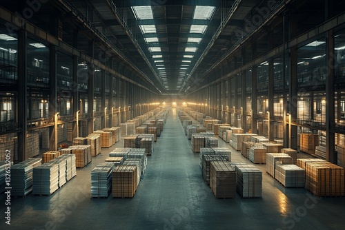 A vast industrial warehouse filled with neatly stacked boxes