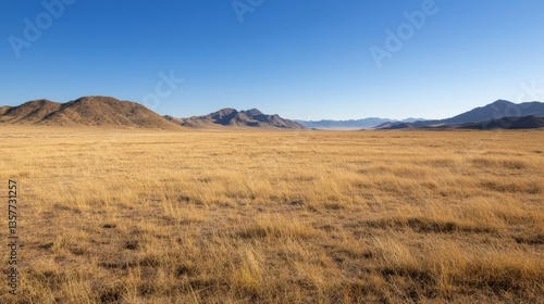A vast, open landscape featuring golden grasslands and distant mountains under a clear blue sky, evoking a sense of tranquility and natural beauty.