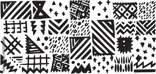 A Vector art of monochrome abstract pattern with hand drawn geometric shapes isolated on white background, perfect for modern designs and artistic backgrounds isolated on white background