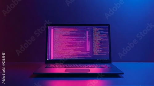 "A vector illustration featuring a front view of a sleek, modern laptop on a clean desk. The laptop screen displays lines of computer code, symbolizing programming and software development.