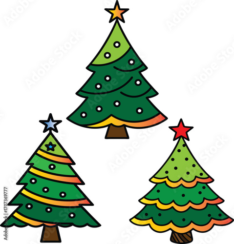 A vector illustration of a set of colorful Christmas trees with festive ornaments and a star on top, perfect for the holiday season
