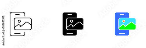 A vector illustration of a smartphone with a gallery icon, which represents the device's photo and video gallery. Vector set of icons in line, black and colorful styles isolated.