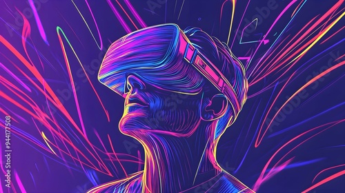 A vector illustration portraying a man wearing virtual reality glasses, immersed in an abstract VR world filled with neon lines