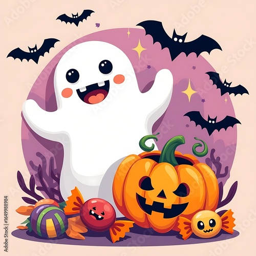 A vector illustration set for a spooky Halloween celebration featuring a pumpkin, witch, cat, and bat with autumn and horror elements