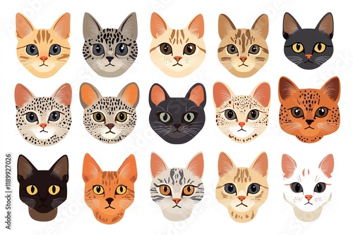 A vector illustration set of various cat breeds, such as Abyssinian, Persian, and Siamese, designed in a cute flat style with soft colors on a white background