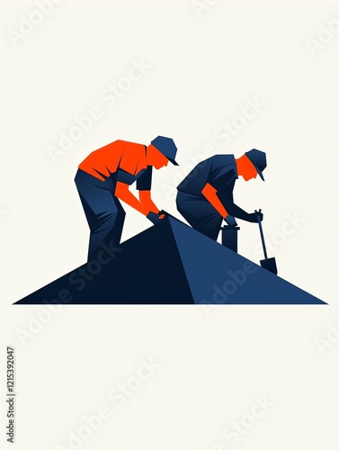 A vector logo featuring two workers on a roof building a house with tools.