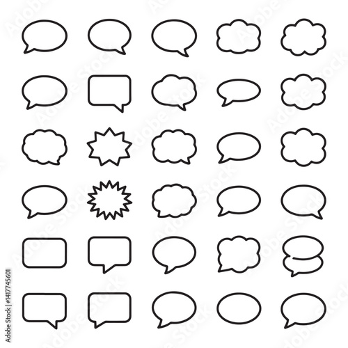 A vector set features various cartoon speech bubbles, including talk clouds and comic dialog balloons for chat and thought illustration