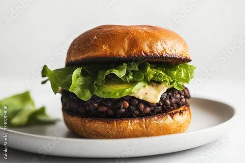A vegan black bean burger topped with creamy avocado, crisp lettuce, and a toasted bun, set on a sleek plate against a simple white background