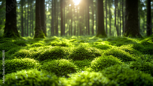 A verdant forest floor covered in moss sunlight filtering through tall trees creating a peaceful immersive natural e
