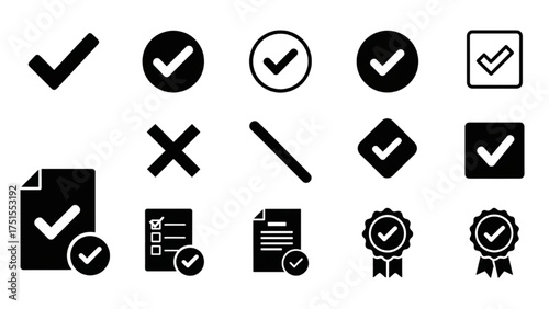 A versatile collection of black checkmark and approval icons representing concepts of validation and choice