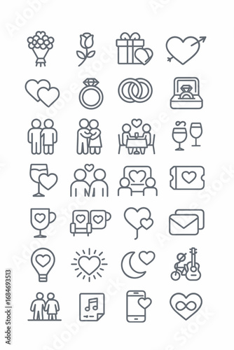 A versatile set of thin line icons symbolizing love, romance, and relationships. Includes symbols for dating, engagement, and weddings