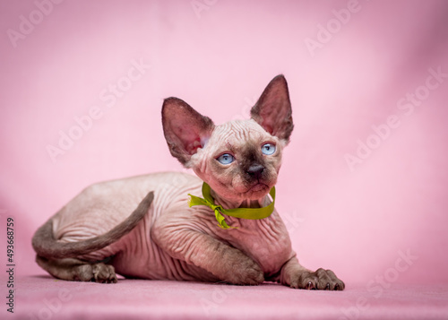 A very beautiful Sphynx cat sitting and posing for photos with a green collar and pink background