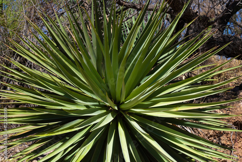 A very large yucca plant growing wild. Long spiky leaves converge at the base of the succulent plant
