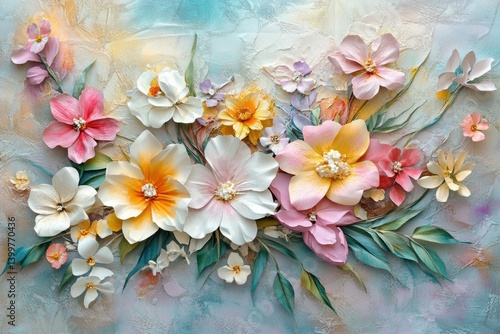 A vibrant 3D floral arrangement showcasing pastel-colored blossoms with textured leaves on a painted canvas.