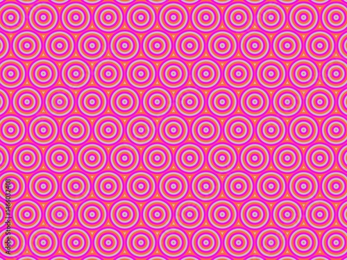 A vibrant abstract background. A repeating pattern of concentric circles in pink, orange, and gray creates a retro, geometric design.
