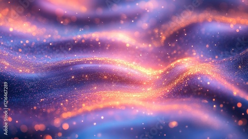 A vibrant abstract background featuring swirling waves of pink and blue light intertwined with glowing bokeh effects.